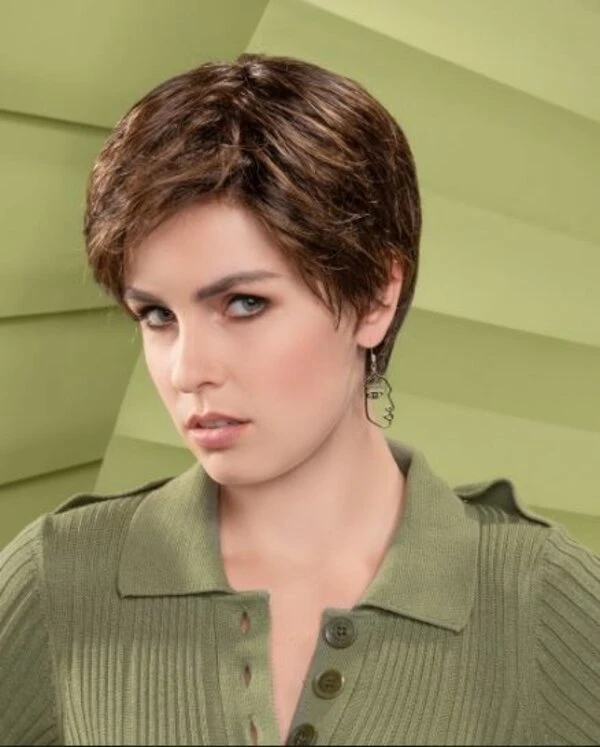Pisa Super is een kort synthetisch haarwerk volledig handgeknoopt + lace front+ monofilament. Kleur van het model is chocolate mix.